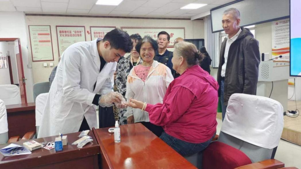 社区医生帮助老年人测量血糖